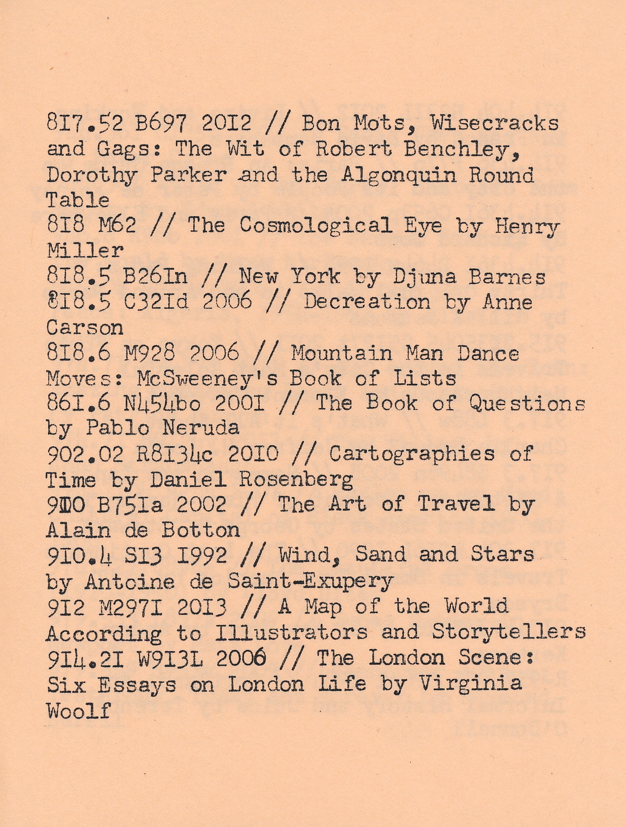 This book is the physical manifestation of an ongoing list compiled over the years while browsing the shelves of the Multnomah County Library in Portland, Oregon. The list has grown to be a curated collection, a portrait of the library's holdings through the eyes of another.