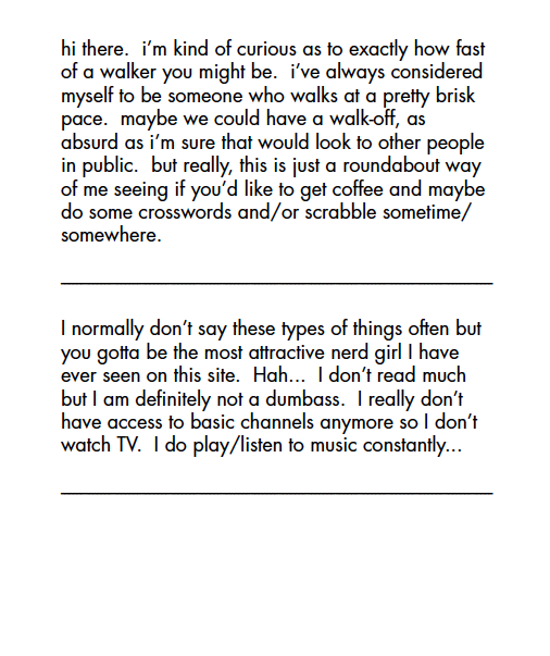 OK Cupid Messages I Have Not Responded To is a chronicle of real messages received during a stint on the online dating website, OK Cupid. These unanswered messages are here presented as a brief glimpse into the world of online dating. This publication brags no ability to summarize the online dating experience, but instead exists to provide entertainment to its readers (though not at the expense of the message authors, whose identities remain anonymous).